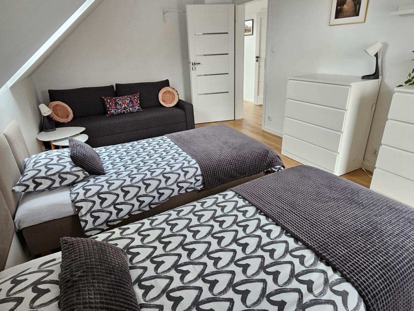 Dom z 2 sypialniami. Boasting a private entrance, this holiday home comes with 1 living room, 2 separate bedrooms and 2 bathrooms with a shower and a hairdryer. Guests will find a stovetop, a refrigerator, a dishwasher and kitchenware in the kitchenette. The holiday home also includes a barbecue. Featuring a terrace with garden views, this holiday home also features a washing machine and a flat-screen TV with streaming services. The unit has 5 beds. Dom wakacyjny - 8 osobowy. Powierzchnia pokoju ok.: 80 mkw.